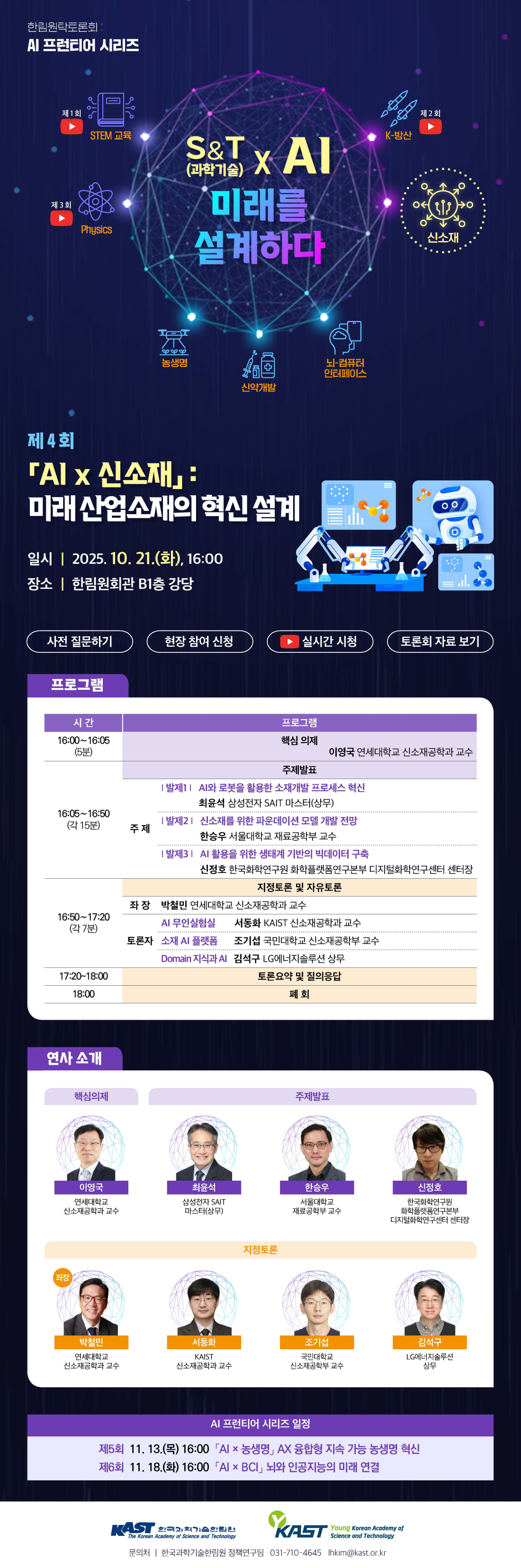 과학기술한림원에서는 아래와 같이 AI X 신소재 주제 제242회 한림원탁토론회 개최하오니 많은 관심 부탁드립니다.