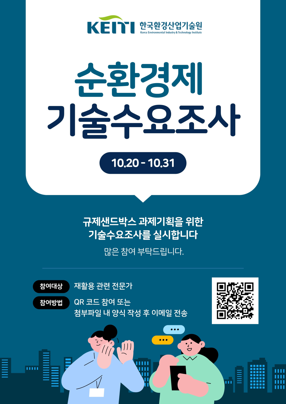 이에 따라, 현장에서 겪고 있는 규제 애로사항과 이를 완화·개선하기 위한 제도적 수요를 파악하고자 「순환경제 규제샌드박스 기술수요조사」를 진행하고 있습니다.