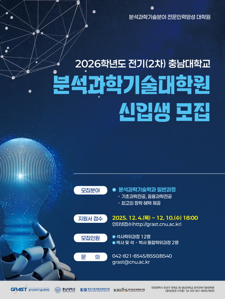 충남대학교 분석과학기술대학원에서 2026학년도 전기(2차) 신입생을 모집을 진행하고 있으니 많은 관심과 지원 부탁드립니다.