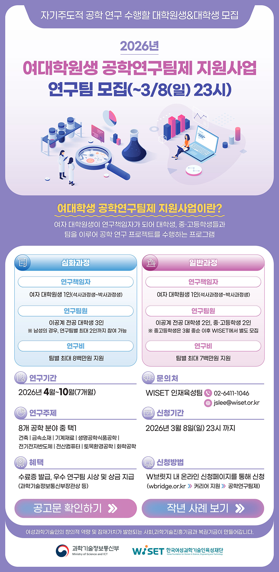 - 기타 [WISET] 여대학원생 공학연구팀제 지원사업 일반과정, 심화과정 연구팀 모집 안내 (~3/8) 2026.02.03